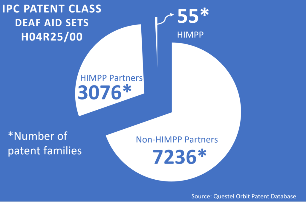 Only a very small fraction of the patents in the Hearing Aid Technology Space is owned by HIMPP, and all HIMPP partners have their own IP portfolios. As seen above less than 1% of the total number of patents owned by the HIMPP partners are owned by the HIMPP partnership. Furthermore the HIMPP partners only owns around 40% of all the patents even though all the major Hearing Aid manufacturers are part of the partnership. This ratio was derived from the dedicated hearing aid patent class (H04R25/00) of the International Patent Class (IPC) system used by the Patent Offices around the world to technically classify patents. Extending this analysis outside the specific patent class H04R25/00 will lead to an even lower ratio of patents owned by the HIMPP partners compared to Non-HIMPP partners. Therefore the majority of patents in the Hearing Instrument space is owned by companies outside the HIMPP partnership, even when considered very narrowly by the dedicated patent class. The HIMPP partners owns a minority of the patents around 40% and only around 0.7% of the patents in the space are owned by the HIMPP partnership.